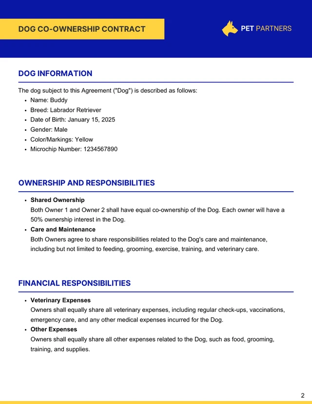 Kostenlose Co-Owner Hund Vertrag Vorlage zum Download. Rechtssicheres Dokument für gemeinsame Hundehaltung mit klaren Pflichten zum Schutz und Wohl des Tieres.
