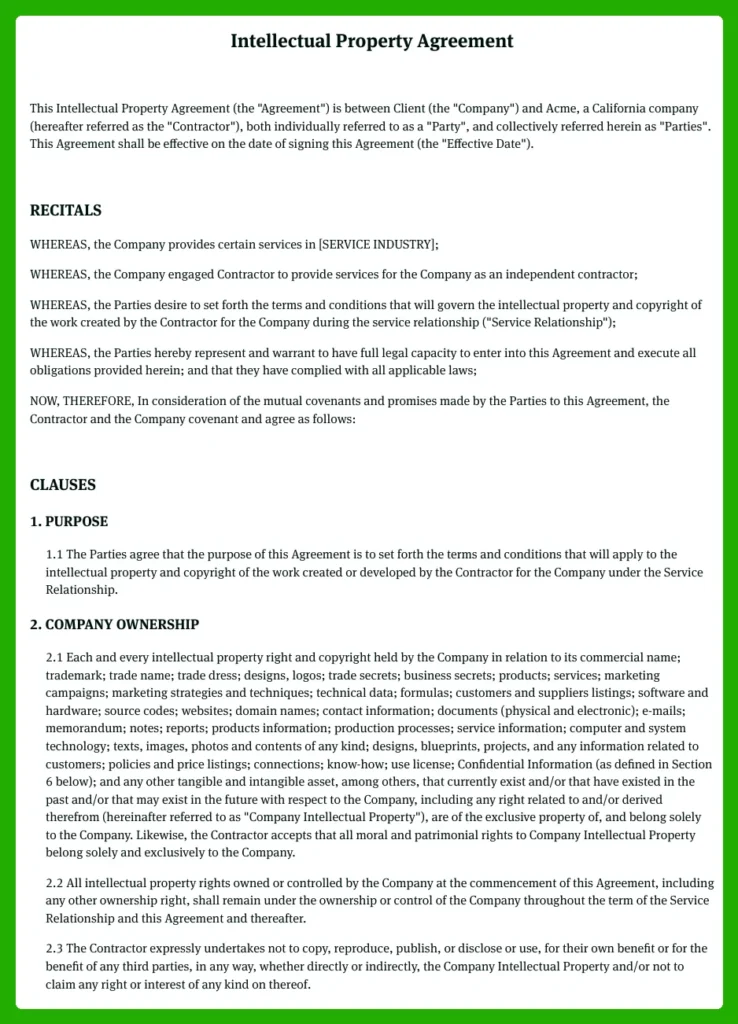 Kostenlose Vorlage für einen Vertrag zum geistigen Eigentum, ideal für kleine und mittelständische Unternehmen, einfach anpassbar und als Muster zur rechtlichen Absicherung verfügbar.