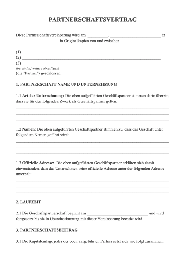 Vertrag Vorlage Partnerschaft innerhalb eines Firmengründung als PDF gratis zum Ausdrucken