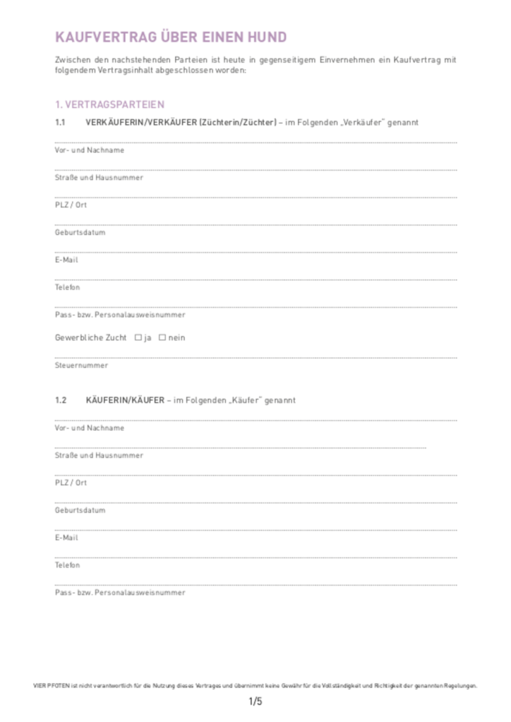 Kauf Vertrag für Hund mit Besuchsrecht Vorlage als PDF gratis zum Ausdrucken