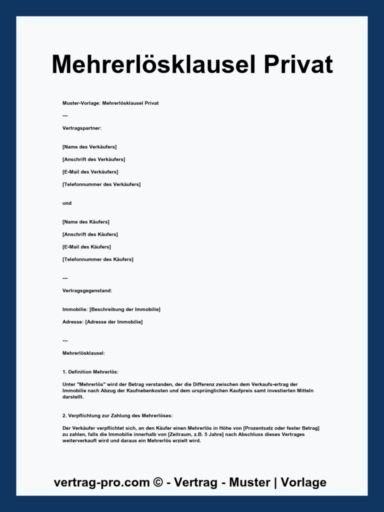 Kostenlose Vorlage für Vertrag über Mehrerlös auf Anderkonto beim Notar zum Download, inklusive Regelungen zu Besitz- und Eigentumsübergang sowie Beteiligung eines Anwalts.