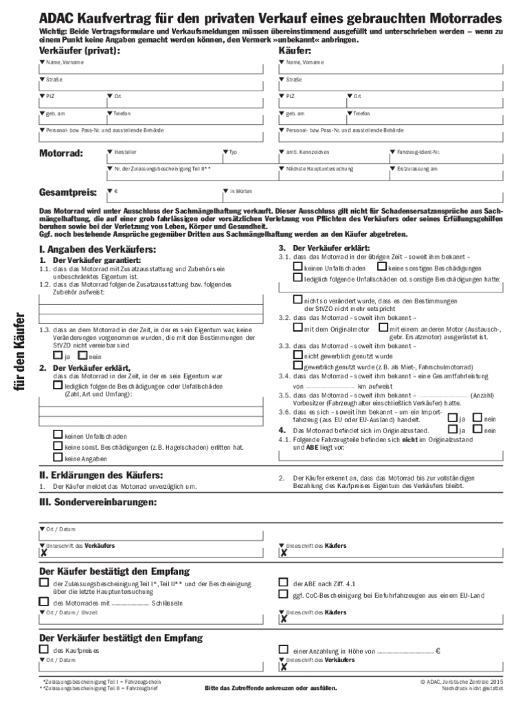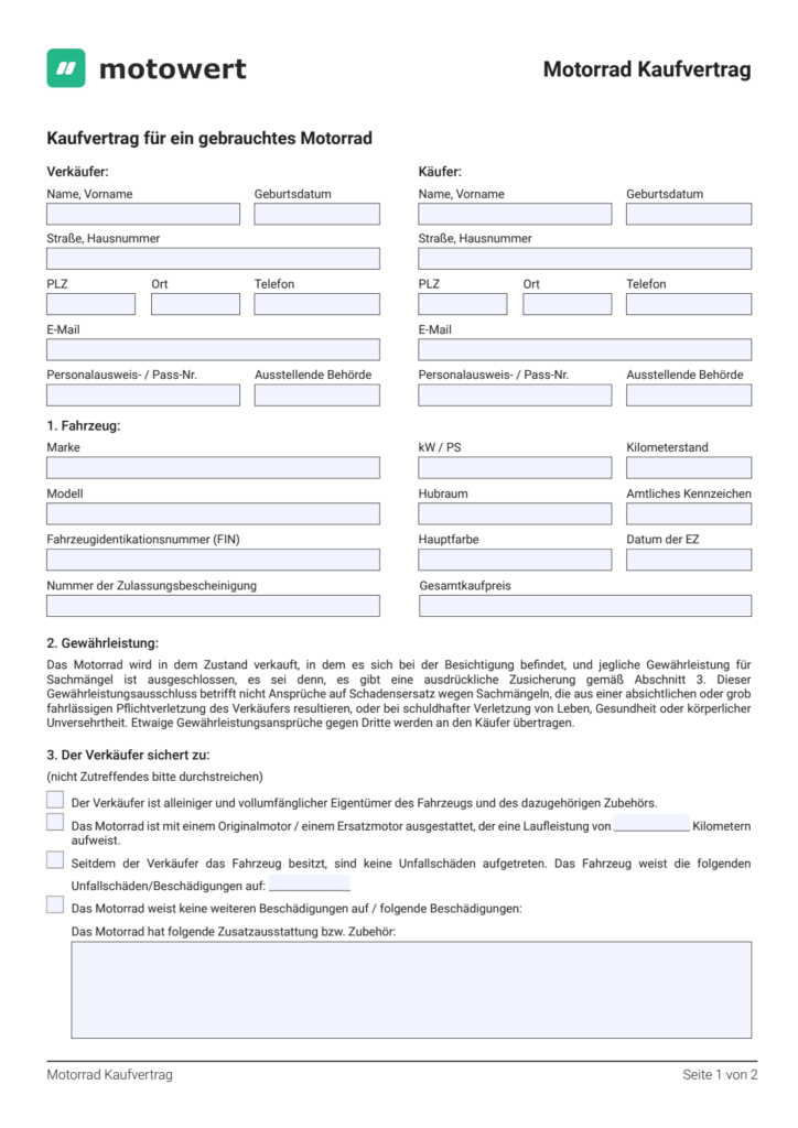 Kostenlose Vorlage für einen privaten Motorrad-Kaufvertrag zum Download. Einfach ausfüllen mit Angaben zu Marke, Modell, Kilometerstand und mehr für einen sicheren Motorradverkauf.