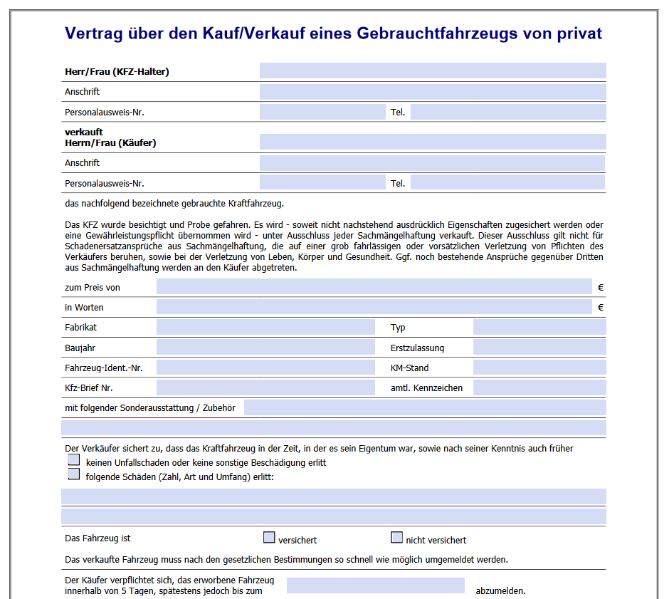 Kostenlose KFZ Verkauf Vertrag Vorlage zum Download. Ein Exemplar für Käufer und Verkäufer, einfach ausfüllen und ankreuzen. Ideal für sicheren Fahrzeugverkauf mit allen wichtigen Angaben.