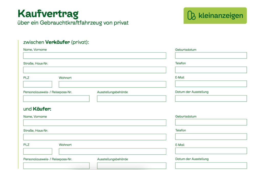 Kostenloser privater Kaufvertrag für Gebrauchtwagen zum Download. Einfach ausfüllen und sicher ein Auto von privat verkaufen – inklusive Marke, Modell und Fahrzeugdetails.