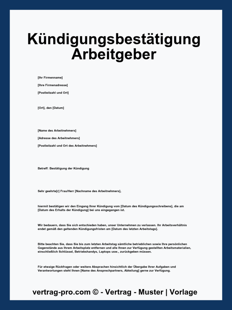 Kostenlose Vorlage für eine Kündigungsbestätigung vom Arbeitgeber herunterladen. Bestätigen Sie den Erhalt der Kündigung und das Beendigungsdatum schriftlich einfach und rechtssicher.